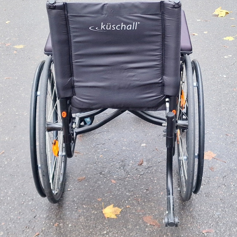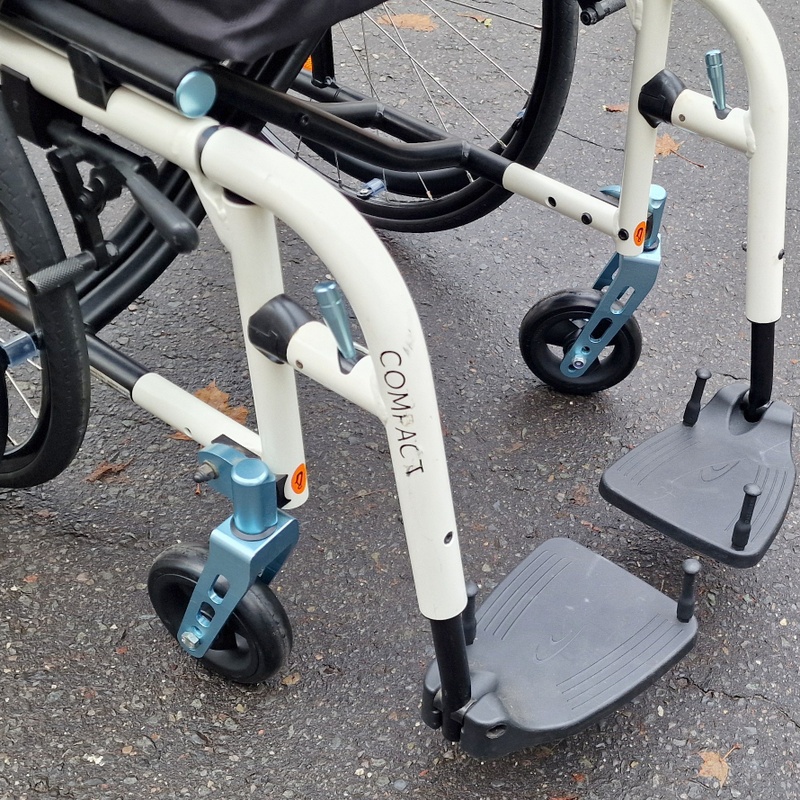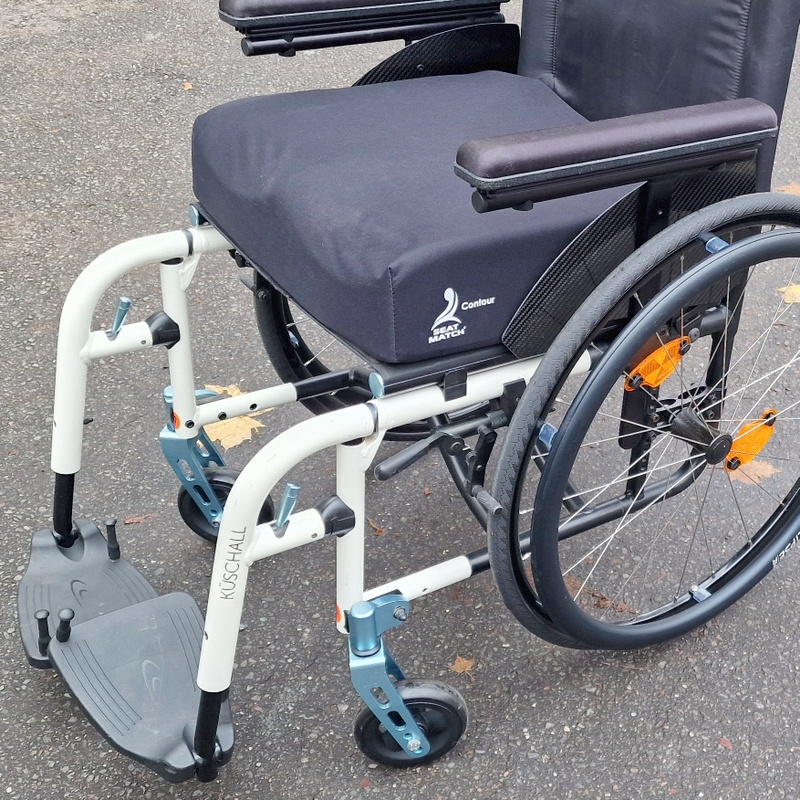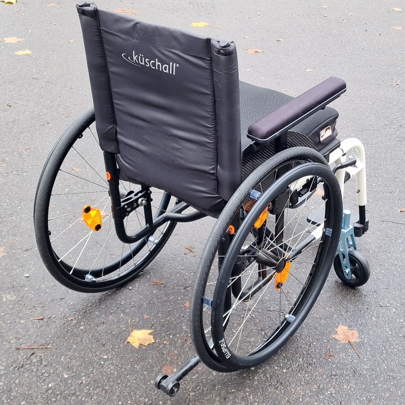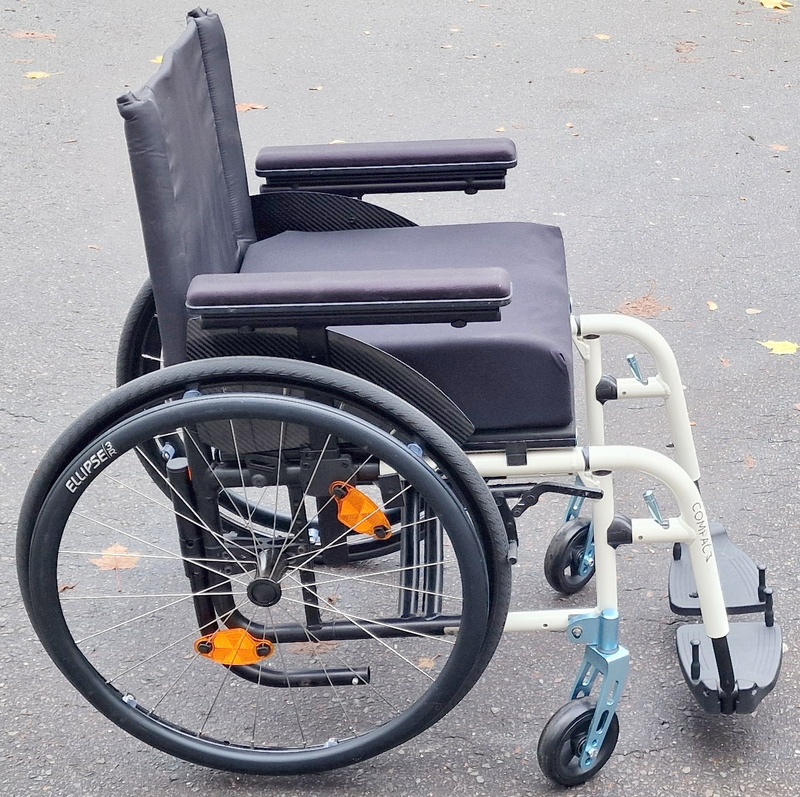 Kuschall compact folding wheelchair, 2015 Model Ex display then stored for a number of years, 440mm Seat Width, 420mm Seat Depth, Ellipse Handrims, Solid tires, Gel arm pads, Carbon side guards, Anti tipper, Lots of height adjustment on this chair. Pneumatic tires can be fitted if needed. Please contact me to discuss.