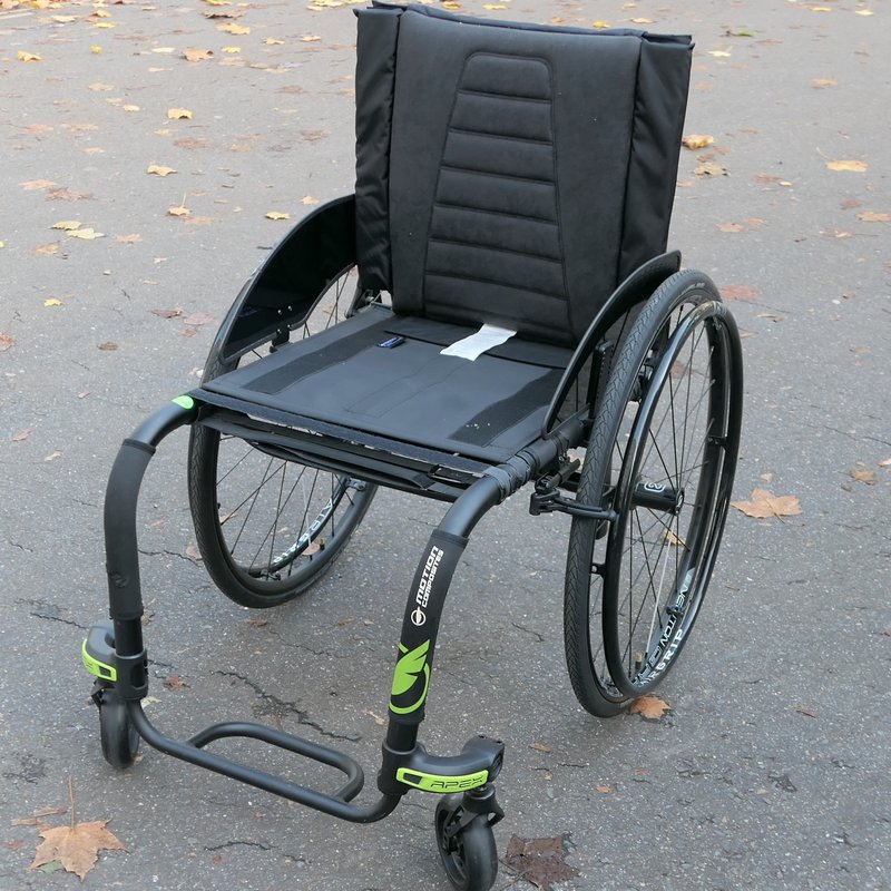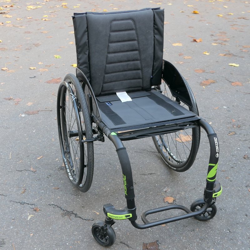 Motion Composites Apex Alu active wheelchair, 2022 ex demo, 420mm x 440mm seat width,depth (please note the seat width measurement was taken from the side guard to side guard 440mm) the actual seat width from the center of the frame to center of frame is 420mm) Rubber coated handrims, solid tires, fantastic chair, lightweight, high specification.