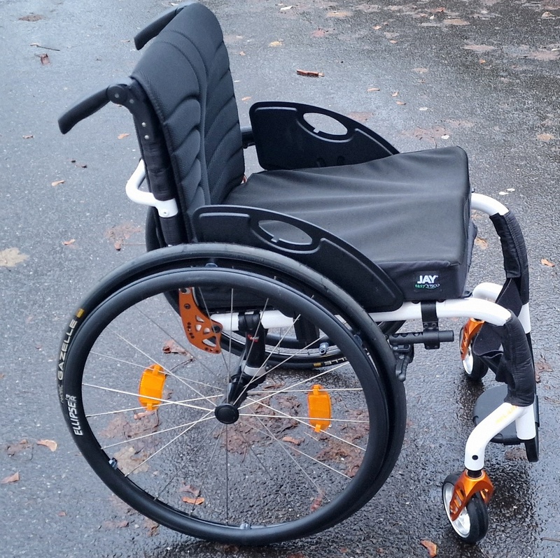 Quickie Helium wheelchair. 2011 Model, 42cm x 44cm seat width/depth, I’ve removed the one arm drive unit and put it back to standard. Ellipse Handrims, Omobic Gazelle tires, New backrest cover, New Jay Easy Visco Cushion 44cm x 44cm
