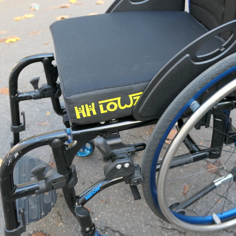 Quickie Neon, 2019 model, 420mm x 440mm seat width/depth, 120kg max user weight, anti tippers, attendant height adjustable handles, brace bar, the frame does have scuff marks as shown, mechanically the chair is excellent, new cushion included.